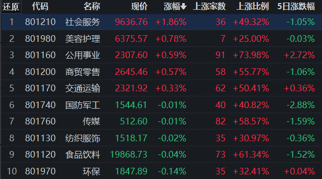 31類申萬一級行業(yè)中,有5類上漲,其中,社會服務(wù)漲幅達1.86%,居首,美容護理和公用事業(yè)緊隨其后;下跌方面,銀行跌幅居前,下跌1.85%。