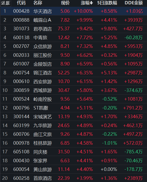 標的方面,東莞證券表示,國內(nèi)防疫工作優(yōu)化逐步推進,旅游出行信心有望逐漸修復(fù)。國際航線客運力同比增長近九成,出入境限制逐漸松動,推薦優(yōu)先受益于出入境限制放松的出境游龍頭眾信旅游(002707);機場免稅業(yè)務(wù)有望復(fù)蘇的免稅龍頭中國中免(601888);建議布局業(yè)績彈性較大的景區(qū)個股云南旅游(002059)、天目湖(603136)、宋城演藝(300144);建議關(guān)注具有餐飲宴會+預(yù)制菜成長屬性的同慶樓(605108)等。