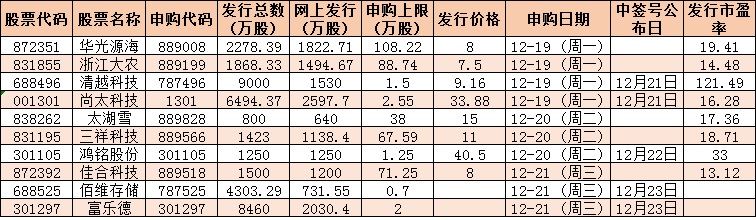 根據(jù)發(fā)行安排,下周(12月19日-23日)有10只新股發(fā)行,周一安排4只,周二和周三分別有3只。周一分別為,尚太科技、華光源海、浙江大農(nóng)、清越科技;周二為,太湖雪、三祥科技、鴻銘股份;周三為,佳合科技、佰維存儲(chǔ)、富樂(lè)德。