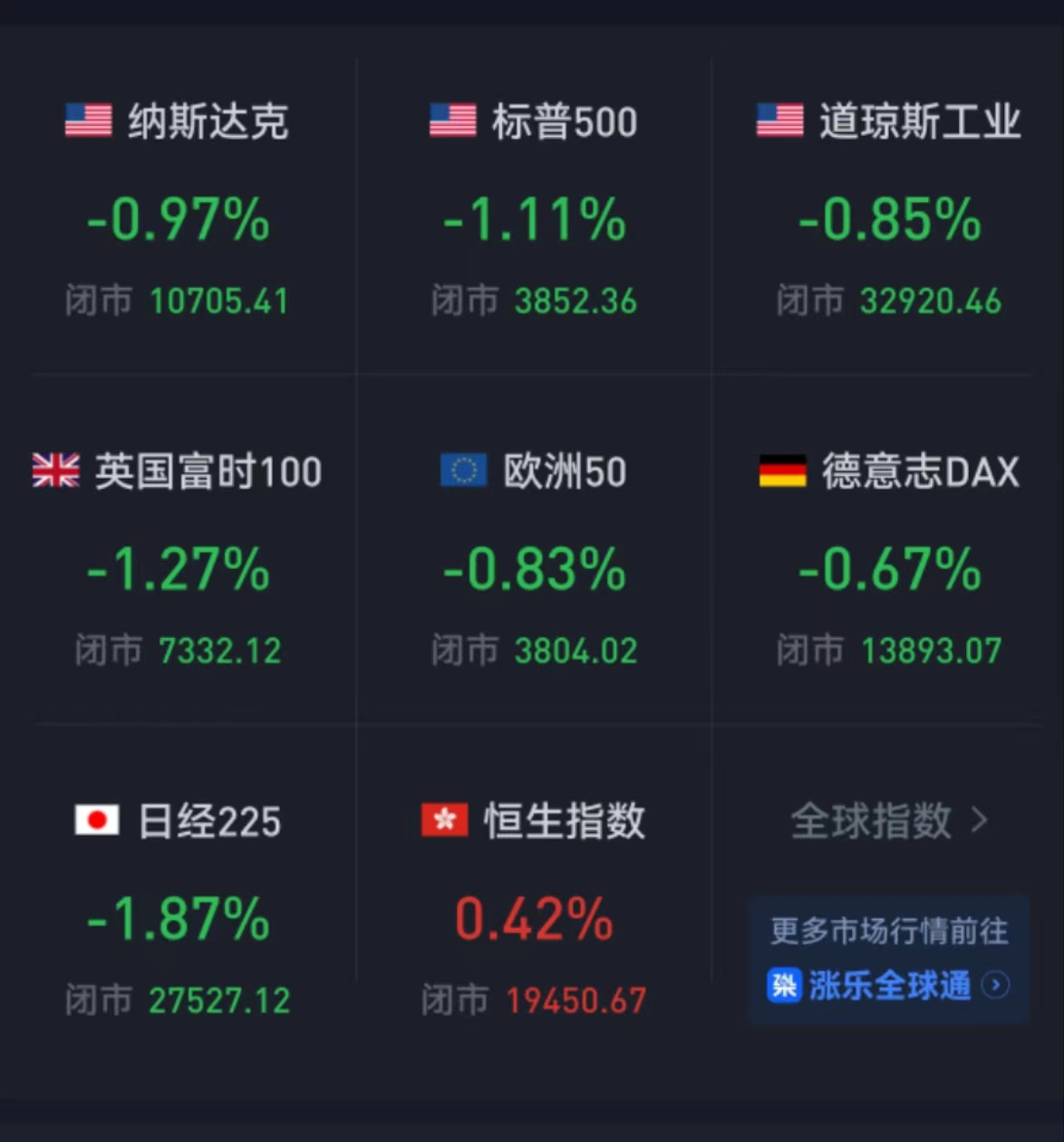 周五,美國(guó)三大股指全線收跌,道指跌0.85%報(bào)32920.46點(diǎn),標(biāo)普500指數(shù)跌1.11%報(bào)3852.36點(diǎn),納指跌0.97%報(bào)10705.41點(diǎn)。本周,道指跌1.66%,標(biāo)普500指數(shù)跌2.08%,納指跌2.72%。