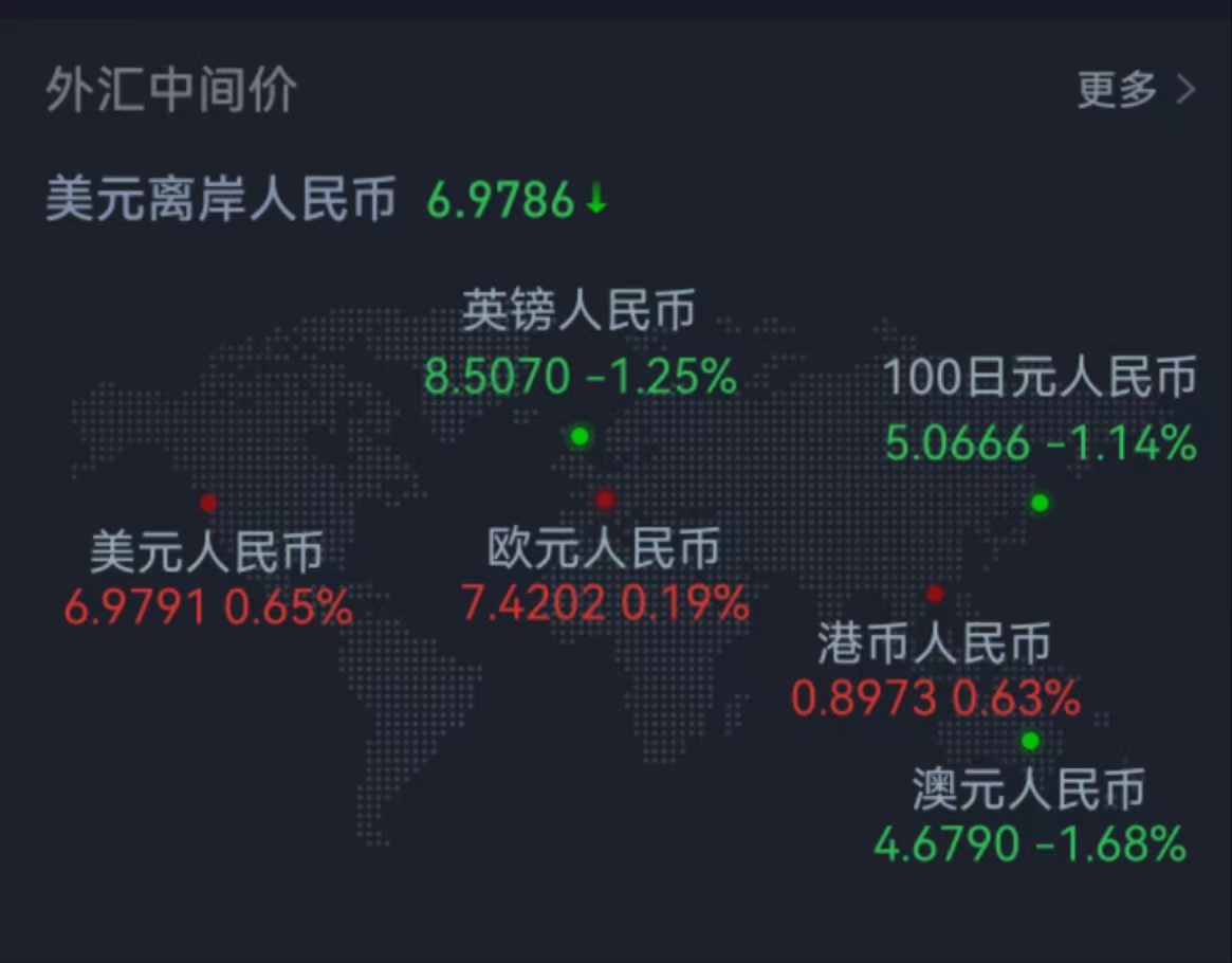 周五在岸人民幣兌美元16:30收盤報(bào)6.9716,較上一交易日下跌26個(gè)基點(diǎn),本周累計(jì)下跌236個(gè)基點(diǎn),夜盤23:30收?qǐng)?bào)6.9750。人民幣兌美元中間價(jià)報(bào)6.9791,調(diào)貶448個(gè)基點(diǎn),調(diào)貶幅度為5月27日以來(lái)最大,本周累計(jì)調(diào)貶203個(gè)基點(diǎn)。