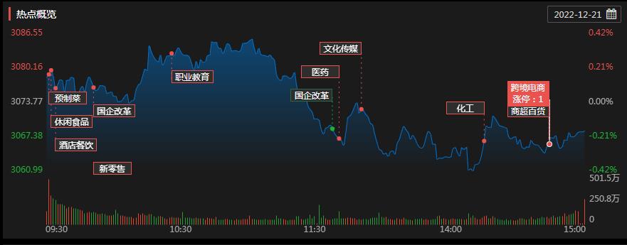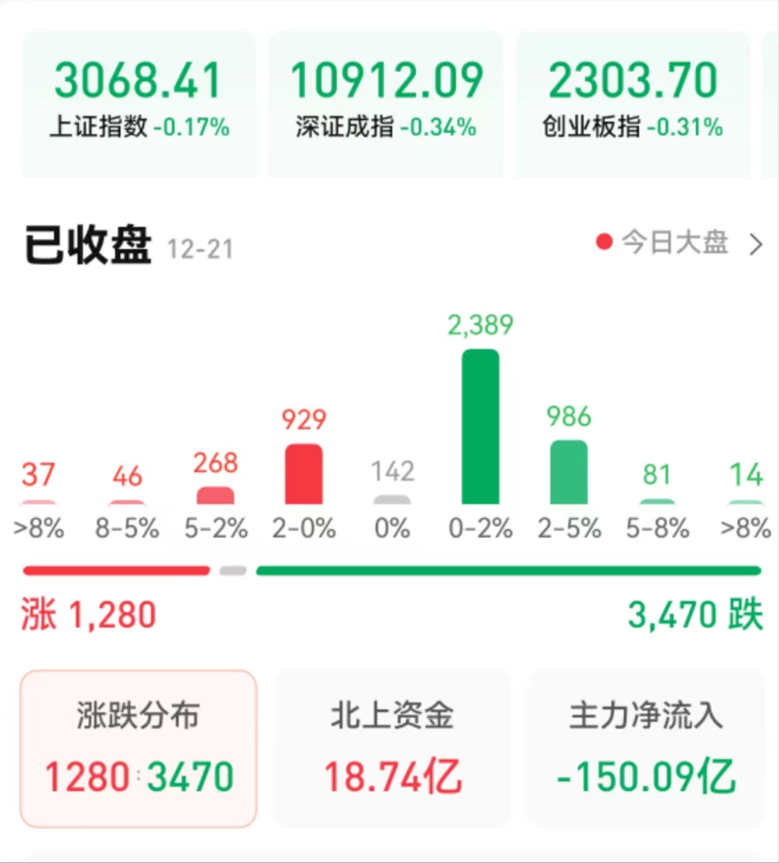 周三(12月21日),A股三大指數(shù)縮量震蕩,小幅下跌。截至收盤,上證指數(shù)跌0.17%報3068.41點(diǎn),深證成指跌0.34%報10912.09點(diǎn),創(chuàng)業(yè)板指跌0.31%報2303.7點(diǎn),上證50指數(shù)逆市漲0.3%;兩市合計成交金額5747億元,北向資金凈買入額18.74億元??傮w上看,A股個股跌多漲少,其中,漲停個股達(dá)34只,跌停個股達(dá)15只。