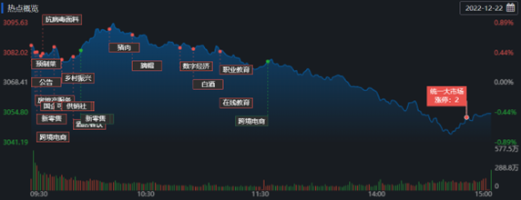 12月22日,A股三大指數(shù)高開低走,滬指開盤重回60日均線,盤中再度失守,滬指在該線已反復爭奪3個交易日。截至收盤,上證指數(shù)跌0.46%報3054.43點;深證成指跌0.33%報10876.31點,創(chuàng)業(yè)板指跌0.36%報2295.32點,A股合計成交額6579.04億元,較前一交易日增長14.65%,北向資金凈買入28.15億元。總體上看,A股個股跌多漲少,有843只上漲,4106只下跌。