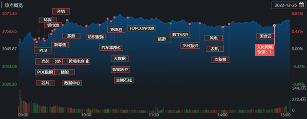 12月26日,A股三大指數(shù)高開高走,滬指開盤收復5日均線,距60日均線僅一步之遙。截至收盤,上證指數(shù)漲0.65%報3065.56點;深證成指漲1.19%報10978.99點,創(chuàng)業(yè)板指漲1.98%報2331.41點,A股合計成交額6246.01億元??傮w上看,A股個股漲多跌少,有3729只上漲,1171只下跌。