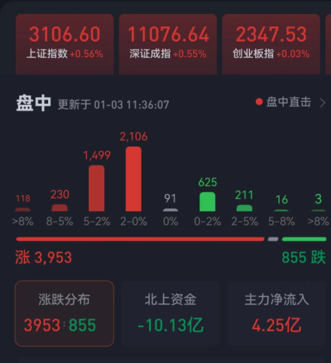 周二(1月3日),三大股指繼續(xù)震蕩走強,全線飄紅。截至上午收盤,上證指數(shù)漲幅達0.56%,報3106.60點;深證成指和創(chuàng)業(yè)板指漲幅分別為0.55%和0.03%;滬深兩市合計成交額4672.2億元,總體來看,兩市個股漲多跌少,上漲個股近4000只,其中,漲停個股達79只,跌停個股達3只。