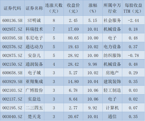 表:連續(xù)上漲3日且今日收盤漲停股一覽