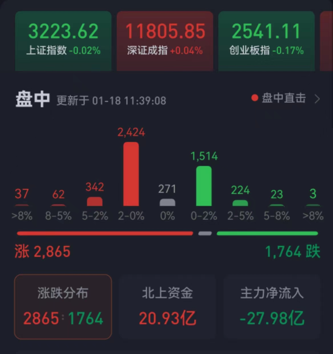 周三(1月18日)早上,三大股指橫盤波動,略有漲跌。截至上午收盤,上證指數(shù)微跌0.02%,報3223.62點;深證成指微漲0.04%,創(chuàng)業(yè)板指跌0.17%;滬深兩市合計成交額3908.8億元,總體來看,兩市個股漲多跌少。