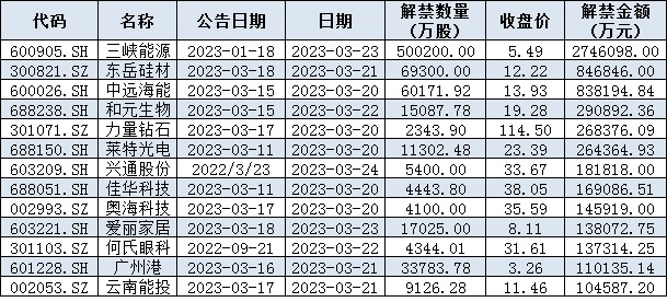 與此同時(shí),統(tǒng)計(jì)顯示,下周(3月20日-24日)共有73家公司限售股陸續(xù)解禁,按最新收盤價(jià)計(jì)算,解禁市值為700.68億元。從解禁市值來看,三峽能源(274.61億元)、東岳硅材(95.68億元)、中遠(yuǎn)海能(83.82億元)等公司解禁金額均超80億元。