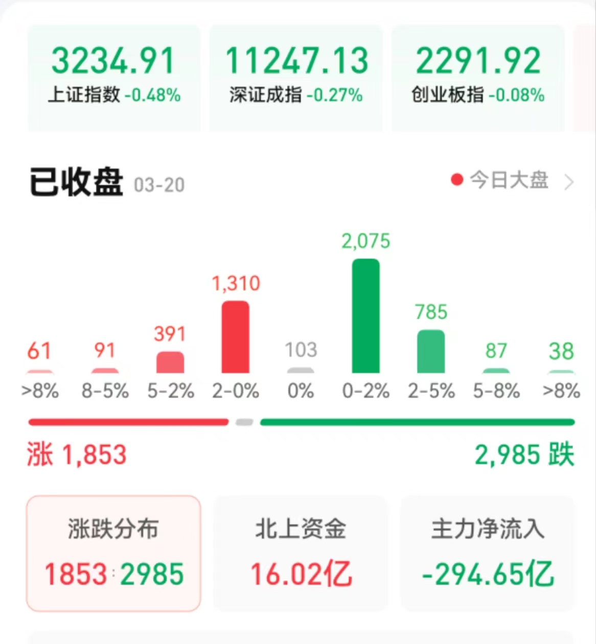 周一(3月20日),A股三大指數(shù)震蕩整理,略有回落。截至收盤,上證指數(shù)跌0.48%報3234.91點,深證成指跌0.27%報11247.13點,創(chuàng)業(yè)板指微跌0.08%報2291.92點;兩市合計成交金額達10575億元??傮w上看,兩市個股跌多漲少。其中,漲停個股達25只,跌停個股達15只。