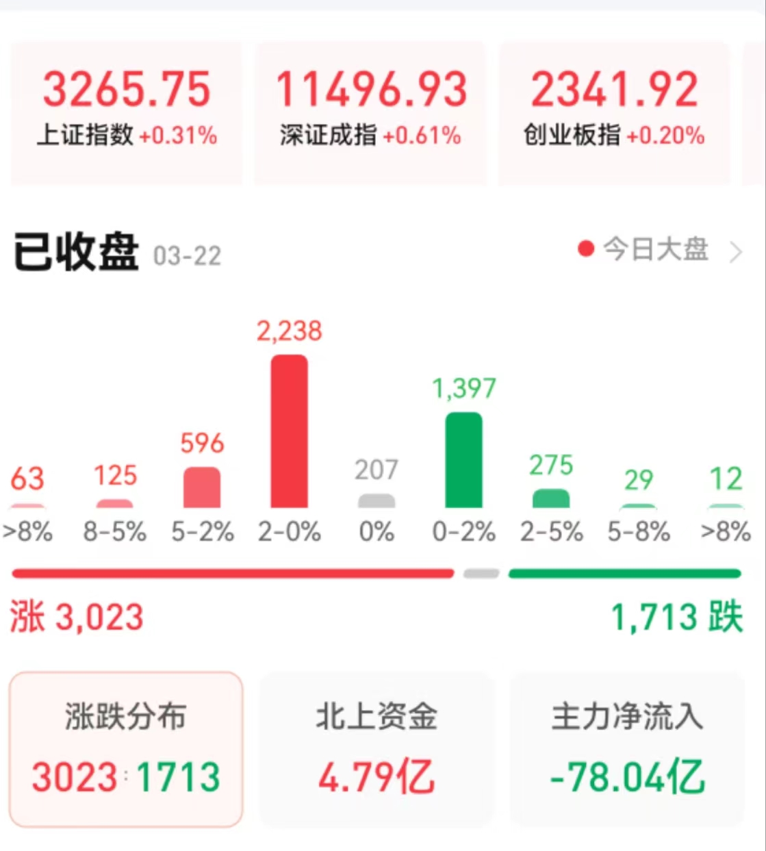 周三(3月22日),A股三大股指震蕩上行,全線飄紅。截至收盤,上證指數(shù)漲0.31%報(bào)3265.75點(diǎn),深證成指漲0.61%報(bào)11496.93點(diǎn),創(chuàng)業(yè)板指漲0.20%報(bào)2341.92點(diǎn);兩市合計(jì)成交金額9578億元??傮w上看,兩市個(gè)股漲多跌少。其中,漲停個(gè)股達(dá)34只,跌停個(gè)股達(dá)5只。