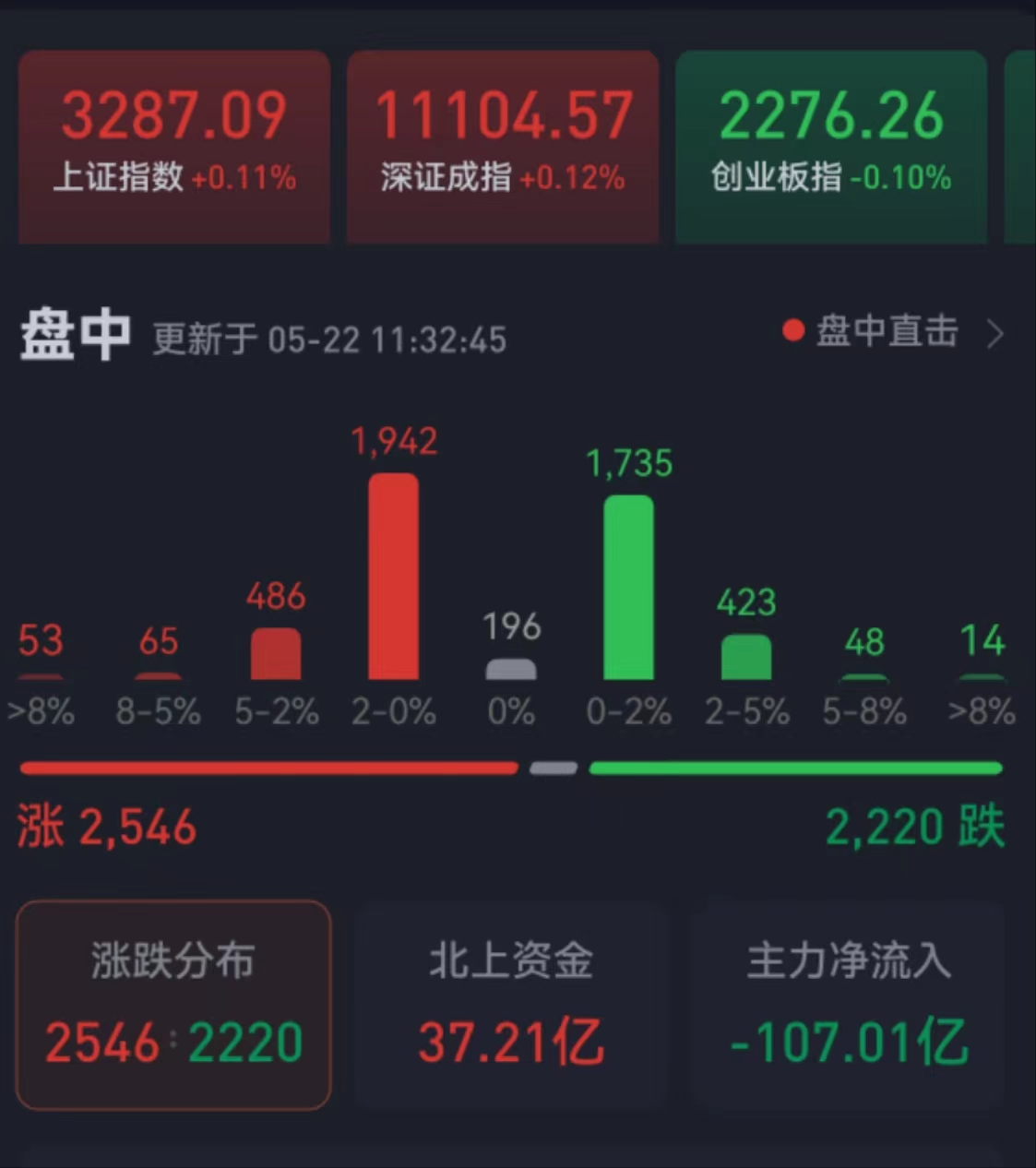 周一(5月22日),三大股指震蕩分化。截至上午收盤,上證指數(shù)上漲0.11%,報3287.09點;深證成指上漲0.12%,創(chuàng)業(yè)板指跌幅為0.10%;滬深兩市合計成交額5193.3億元,總體來看,兩市個股漲多跌少。
