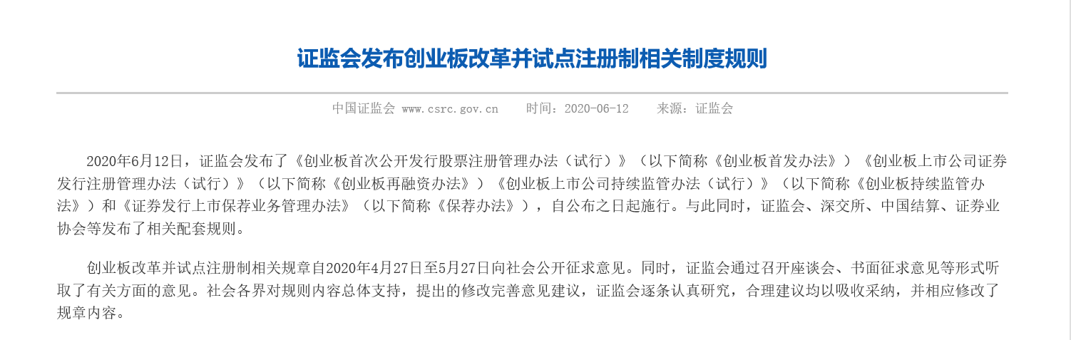 6月12日,證監(jiān)會發(fā)布創(chuàng)業(yè)板改革并試點注冊制相關制度規(guī)則。