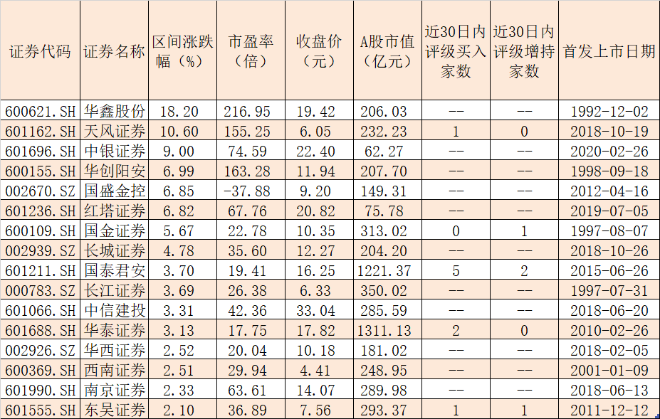 個股方面,華鑫股份、天風證券、中銀證券、華創(chuàng)陽安、國盛金控、紅塔證券、國金證券等7只個股月內累計漲幅逾5%。