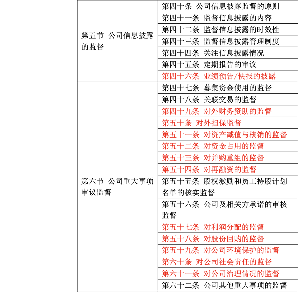 在增加監(jiān)管關(guān)注要點方面,根據(jù)近年來監(jiān)管關(guān)注要點,《指引》增加相應(yīng)條目,如對財務(wù)會計報告的監(jiān)督;業(yè)績預(yù)告/快報的披露監(jiān)督;對外財務(wù)資助、對外擔(dān)保、資產(chǎn)減值與核銷、資金占用、并購重組、再融資、利潤分配、股份回購、公司環(huán)境保護(hù)、公司社會責(zé)任和公司治理情況的監(jiān)督等。