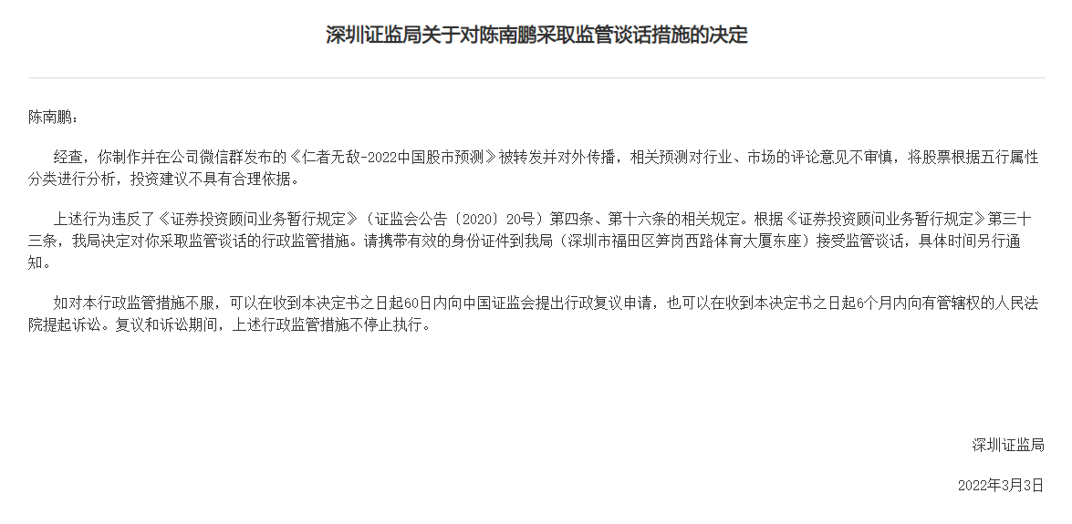 深圳證監(jiān)局表示,經(jīng)查,陳南鵬制作并在公司微信群發(fā)布的《仁者無敵-2022中國股市預測》被轉發(fā)并對外傳播,相關預測對行業(yè)、市場的評論意見不審慎,將股票根據(jù)五行屬性分類進行分析,投資建議不具有合理依據(jù),違反《證券投資顧問業(yè)務暫行規(guī)定》相關規(guī)定。深圳證監(jiān)局對陳南鵬采取監(jiān)管談話的行政監(jiān)管措施。