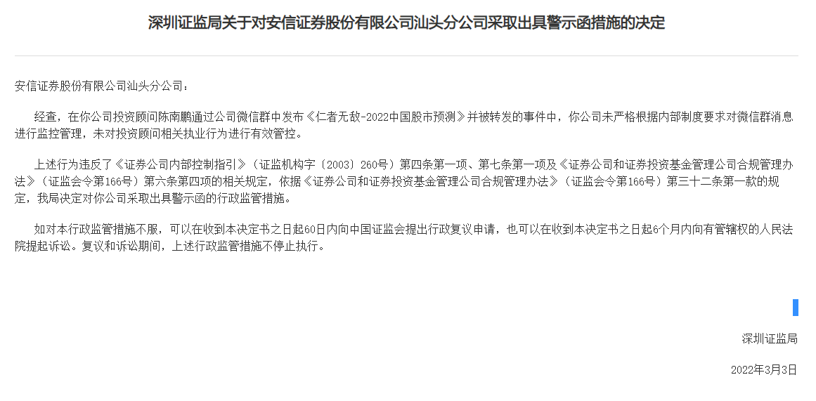 3月11日,深圳證監(jiān)局披露對安信證券汕頭分公司和公司投資顧問陳南鵬的監(jiān)管措施。原因是陳南鵬將股票根據(jù)五行屬性分類進行分析,制作并在公司微信群發(fā)布《仁者無敵-2022中國股市預測》的投資建議,該內(nèi)容被轉發(fā)并對外傳播,相關預測對行業(yè)、市場的評論意見不審慎。深圳證監(jiān)局認為該投資建議不具有合理依據(jù),而公司未對群消息嚴格管控,故對公司和陳南鵬均采取行政監(jiān)管措施。