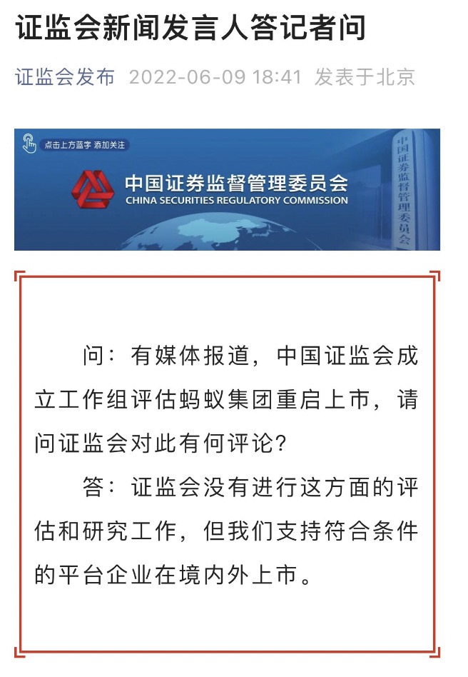 本報(bào)訊 近日,有媒體報(bào)道,中國(guó)證監(jiān)會(huì)成立工作組評(píng)估螞蟻集團(tuán)重啟上市。對(duì)此,6月9日,證監(jiān)會(huì)新聞發(fā)言人答記者問(wèn)時(shí)表示,證監(jiān)會(huì)沒(méi)有進(jìn)行這方面的評(píng)估和研究工作,但我們支持符合條件的平臺(tái)企業(yè)在境內(nèi)外上市。(吳曉璐)