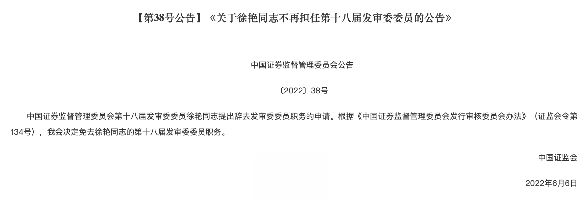 6月24日,中國證監(jiān)會(huì)公告顯示,第十八屆發(fā)審委委員徐艷提出辭去發(fā)審委委員職務(wù)的申請(qǐng),證監(jiān)會(huì)根據(jù)發(fā)行審核委員會(huì)辦法的規(guī)定,免去其發(fā)審委委員職務(wù)。