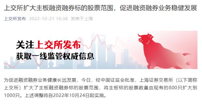 其中,滬市主板標(biāo)的股票數(shù)量由現(xiàn)有的800只擴(kuò)大到1000只,深市注冊(cè)制股票以外的標(biāo)的股票數(shù)量由現(xiàn)有的800只擴(kuò)大到1200只,上述調(diào)整將自2022年10月24日起實(shí)施。