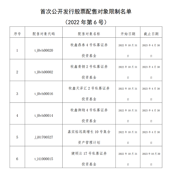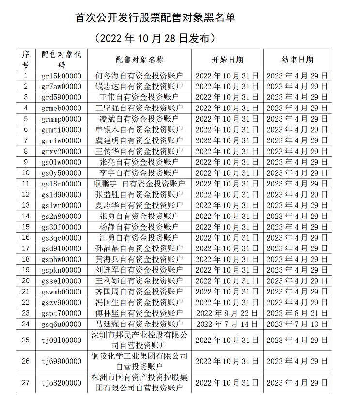 本報訊 10月28日,中證協(xié)發(fā)布《首次公開發(fā)行股票配售對象限制名單公告(2022年第6號)》和《首次公開發(fā)行股票配售對象黑名單公告(2022年第8號)》。