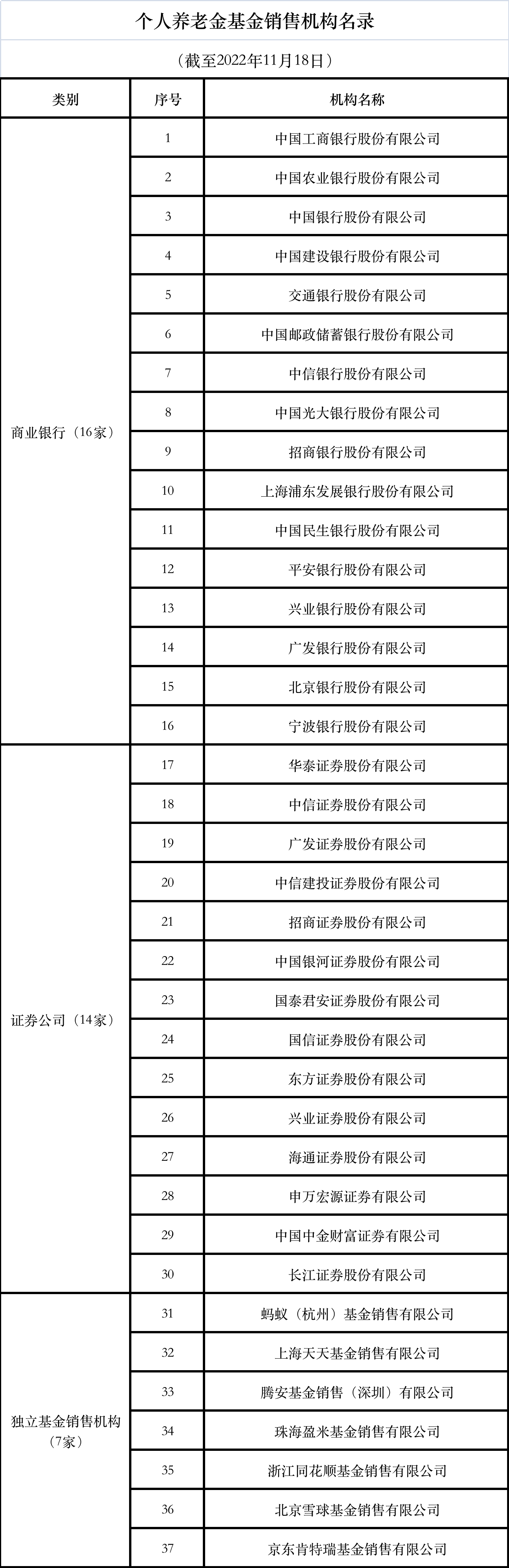 個(gè)人養(yǎng)老金基金銷售機(jī)構(gòu)方面,其中,商業(yè)銀行16家,證券公司14家,獨(dú)立基金銷售機(jī)構(gòu)7家。