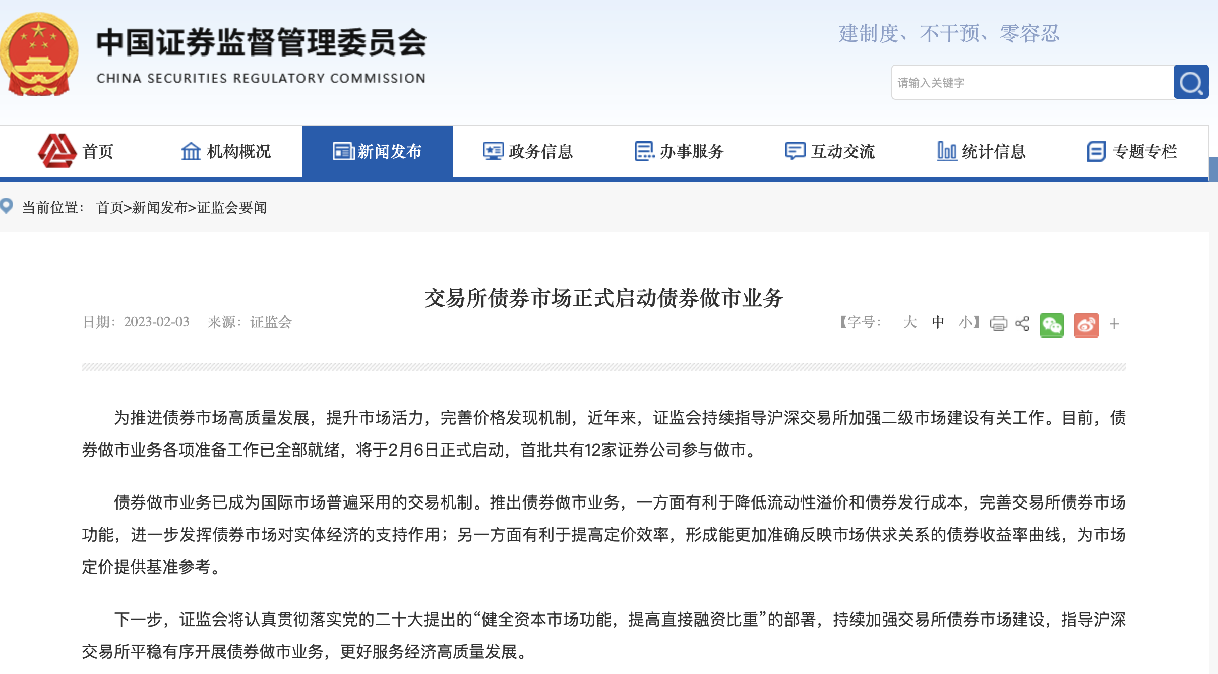 交易所債市債券做市業(yè)務(wù)將于2月6日正式啟動(dòng) 首批12家券商參與2023-02-03 18:29