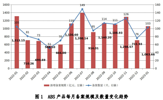 2月22日,中基協(xié)發(fā)布2023年1月份《企業(yè)資產(chǎn)證券化業(yè)務(wù)備案運(yùn)行情況簡報》顯示,2023年1月份,企業(yè)資產(chǎn)證券化產(chǎn)品共備案確認(rèn)103只,新增備案規(guī)模合計1063.66億元。1月份新增備案規(guī)模環(huán)比增長49.41%,同比減少19.00%。