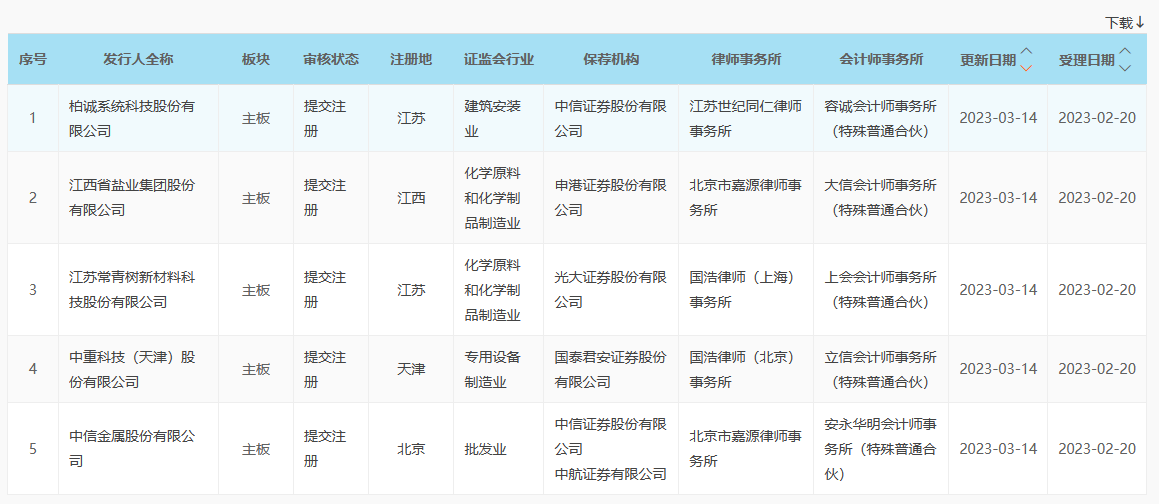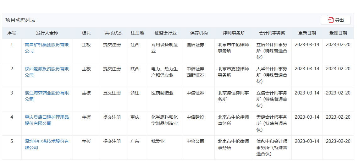 滬深交易所數(shù)據(jù)顯示,截至3月14日發(fā)稿,中信金屬、江鹽股份、常青科技、中重科技、柏誠股份、中電港、陜能股份、海森藥業(yè)、南礦集團(tuán)、登康口腔等10家主板IPO企業(yè)提交注冊,這也是全面注冊制下首批提交注冊的主板IPO企業(yè)。