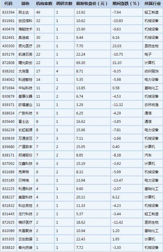 機構調研榜單中,民士達參與調研的機構合計達49家,最受關注;其次是創(chuàng)遠信科、海能技術、奧迪威,參與調研的機構分別有32家、31家、30家。