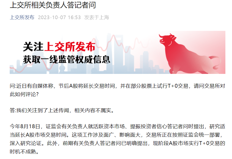據(jù)滬深交易所微信公眾號(hào)消息,10月7日,滬深交易所相關(guān)負(fù)責(zé)人答記者問(wèn)時(shí)表示,“節(jié)后A股將延長(zhǎng)交易時(shí)間,并在部分股票上試行T+0交易”傳聞不屬實(shí)。