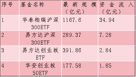 其中,華泰柏瑞滬深300ETF當(dāng)日增加9.87億份,至329.77億份,資金凈流入達(dá)34.94億元。易方達(dá)滬深300ETF當(dāng)日增加4.30億份,至171.08億份,資金凈流入達(dá)7.28億元。此外,易方達(dá)創(chuàng)業(yè)板ETF、富國上證指數(shù)ETF單日“吸金”均超2億元。