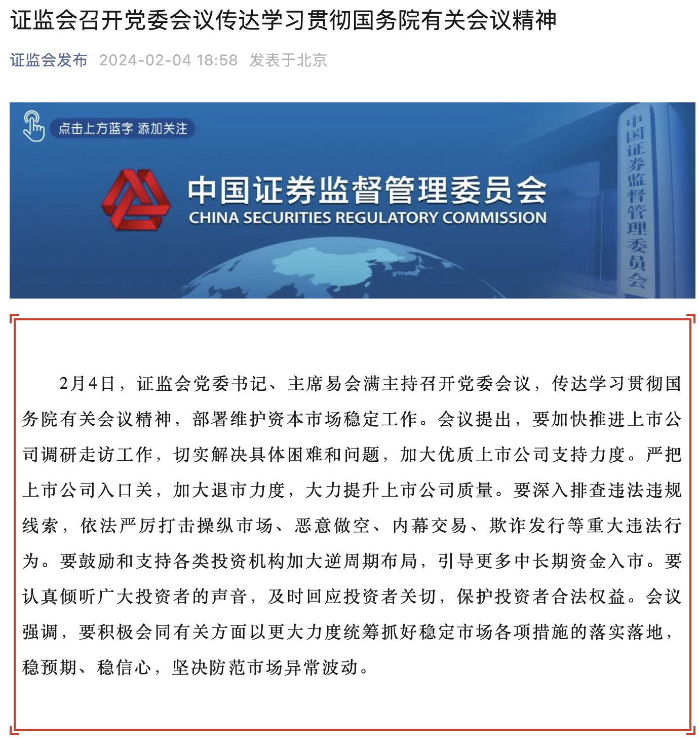 據(jù)證監(jiān)會網(wǎng)站消息,2月4日,證監(jiān)會黨委書記、主席易會滿主持召開黨委會議,傳達學習貫徹國務(wù)院有關(guān)會議精神,部署維護資本市場穩(wěn)定工作。