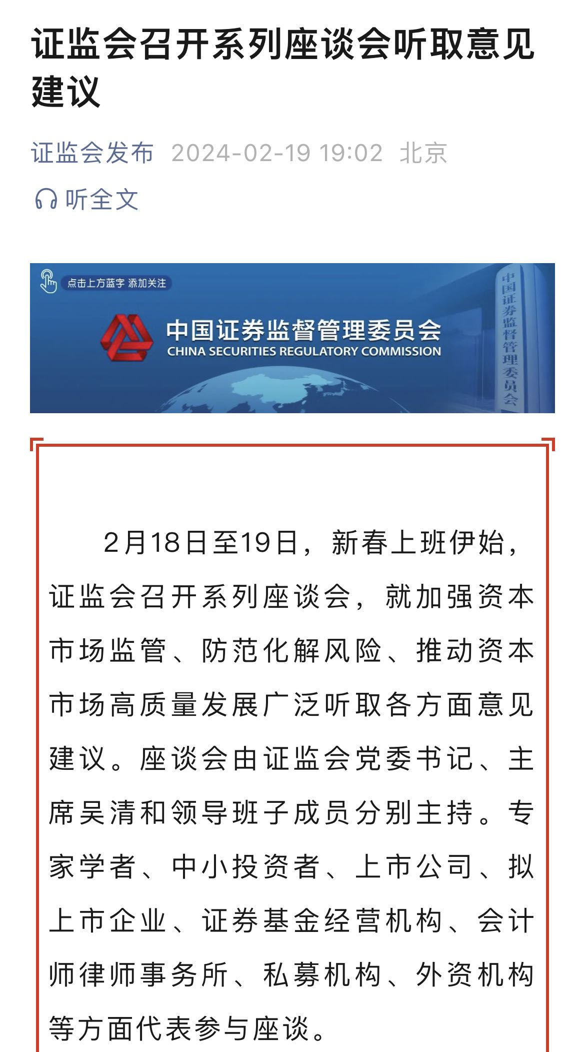 據(jù)證監(jiān)會(huì)網(wǎng)站消息,2月18日至19日,新春上班伊始,證監(jiān)會(huì)召開(kāi)系列座談會(huì),就加強(qiáng)資本市場(chǎng)監(jiān)管、防范化解風(fēng)險(xiǎn)、推動(dòng)資本市場(chǎng)高質(zhì)量發(fā)展廣泛聽(tīng)取各方面意見(jiàn)建議。座談會(huì)由證監(jiān)會(huì)黨委書(shū)記、主席吳清和領(lǐng)導(dǎo)班子成員分別主持。
