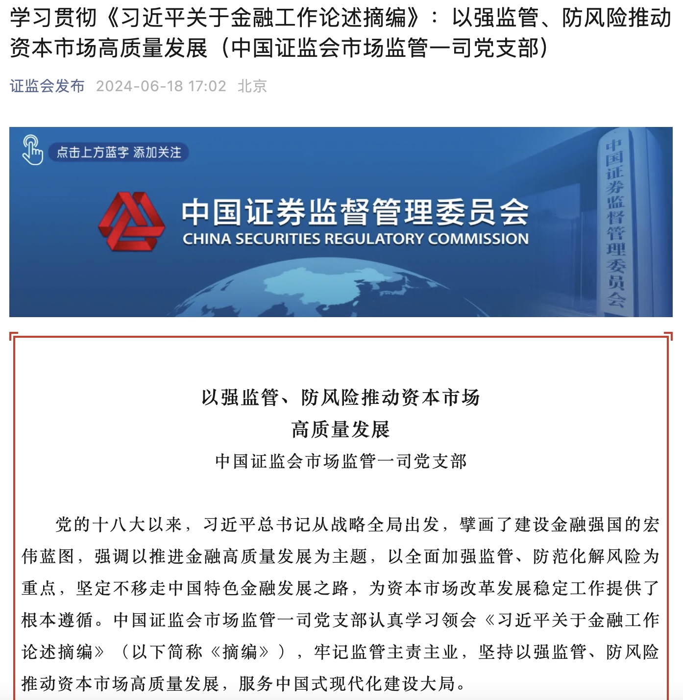 中國證監(jiān)會市場監(jiān)管一司黨支部認真學習領會《習近平關于金融工作論述摘編》(以下簡稱《摘編》),牢記監(jiān)管主責主業(yè),堅持以強監(jiān)管、防風險推動資本市場高質(zhì)量發(fā)展,服務中國式現(xiàn)代化建設大局。