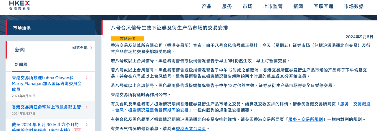 9月6日,港交所發(fā)布八號(hào)臺(tái)風(fēng)信號(hào)生效下證券及衍生產(chǎn)品市場(chǎng)的交易安排。同日,滬深交易所公告,港股通暫停今日交易。