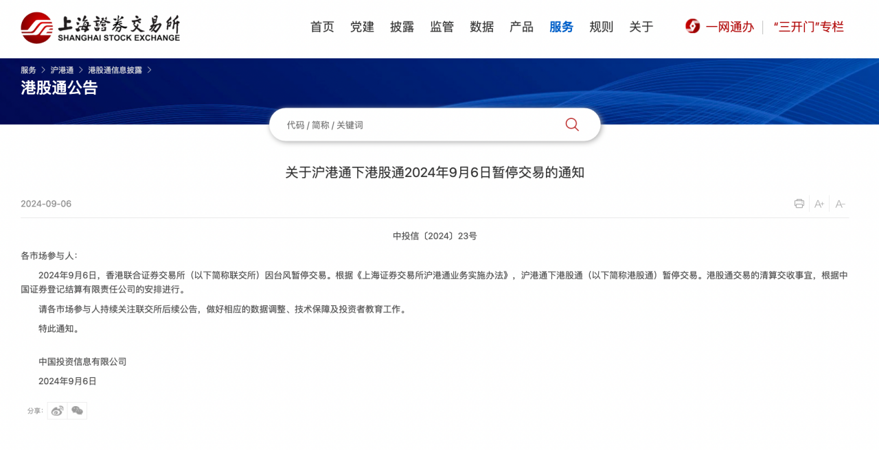 上交所稱,9月6日,港交所因臺(tái)風(fēng)暫停交易。根據(jù)《上海證券交易所滬港通業(yè)務(wù)實(shí)施辦法》,滬港通下港股通暫停交易。港股通交易的清算交收事宜,根據(jù)中國(guó)證券登記結(jié)算有限責(zé)任公司的安排進(jìn)行。