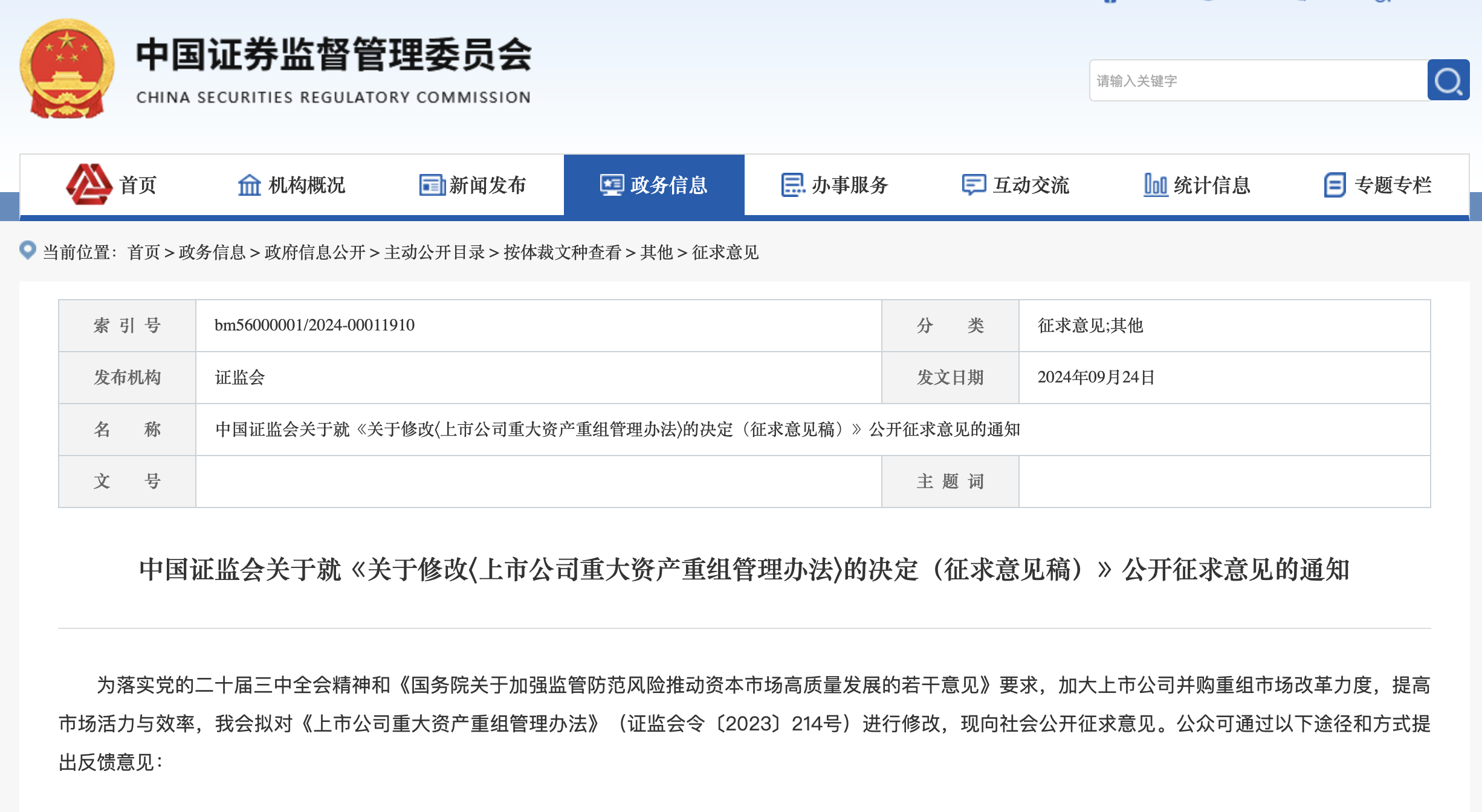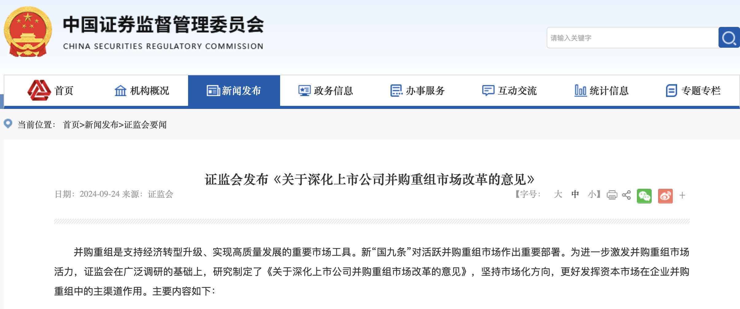 9月24日,證監(jiān)會發(fā)布《關(guān)于深化上市公司并購重組市場改革的意見》(簡稱《意見》或“并購六條”)。為落實《意見》,證監(jiān)會和證券交易所修訂《上市公司重大資產(chǎn)重組管理辦法》(以下簡稱《重組辦法》)等規(guī)則,同步公開征求意見。