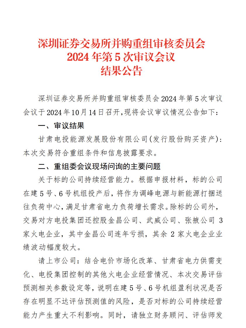 深交所并購重組審核委員會10月14日召開的2024年第5次審議會議結(jié)果公告顯示,甘肅能源發(fā)行股份購買資產(chǎn)交易符合重組條件和信息披露要求。從并購重組審核委員會現(xiàn)場問詢的主要問題來看,主要集中在標的公司持續(xù)經(jīng)營能力方面。