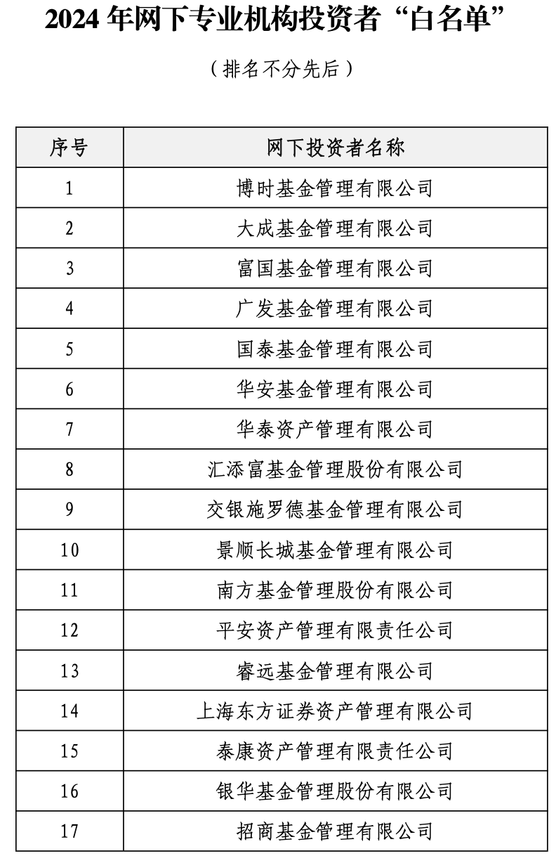 為深入貫徹落實(shí)黨的二十屆三中全會(huì)和中央金融工作會(huì)議精神、新“國(guó)九條”決策部署以及中國(guó)證監(jiān)會(huì)“科創(chuàng)板八條”有關(guān)要求,強(qiáng)化詢報(bào)價(jià)行為監(jiān)管,充分發(fā)揮網(wǎng)下專業(yè)機(jī)構(gòu)投資者示范帶動(dòng)作用,7月25日,中國(guó)證券業(yè)協(xié)會(huì)(以下簡(jiǎn)稱協(xié)會(huì))發(fā)布2024年網(wǎng)下專業(yè)機(jī)構(gòu)投資者“白名單”。