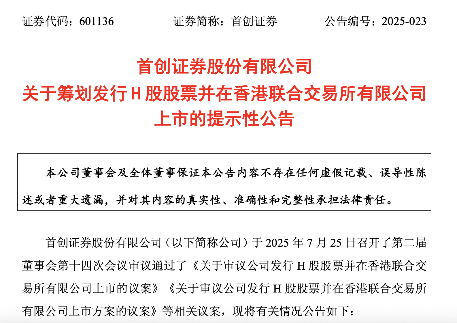 7月25日晚間,首創(chuàng)證券發(fā)布公告稱,于2025年7月25日召開了第二屆董事會(huì)第十四次會(huì)議審議通過(guò)了《關(guān)于審議公司發(fā)行H股股票并在香港聯(lián)合交易所有限公司上市的議案》《關(guān)于審議公司發(fā)行H股股票并在香港聯(lián)合交易所有限公司上市方案的議案》等相關(guān)議案。