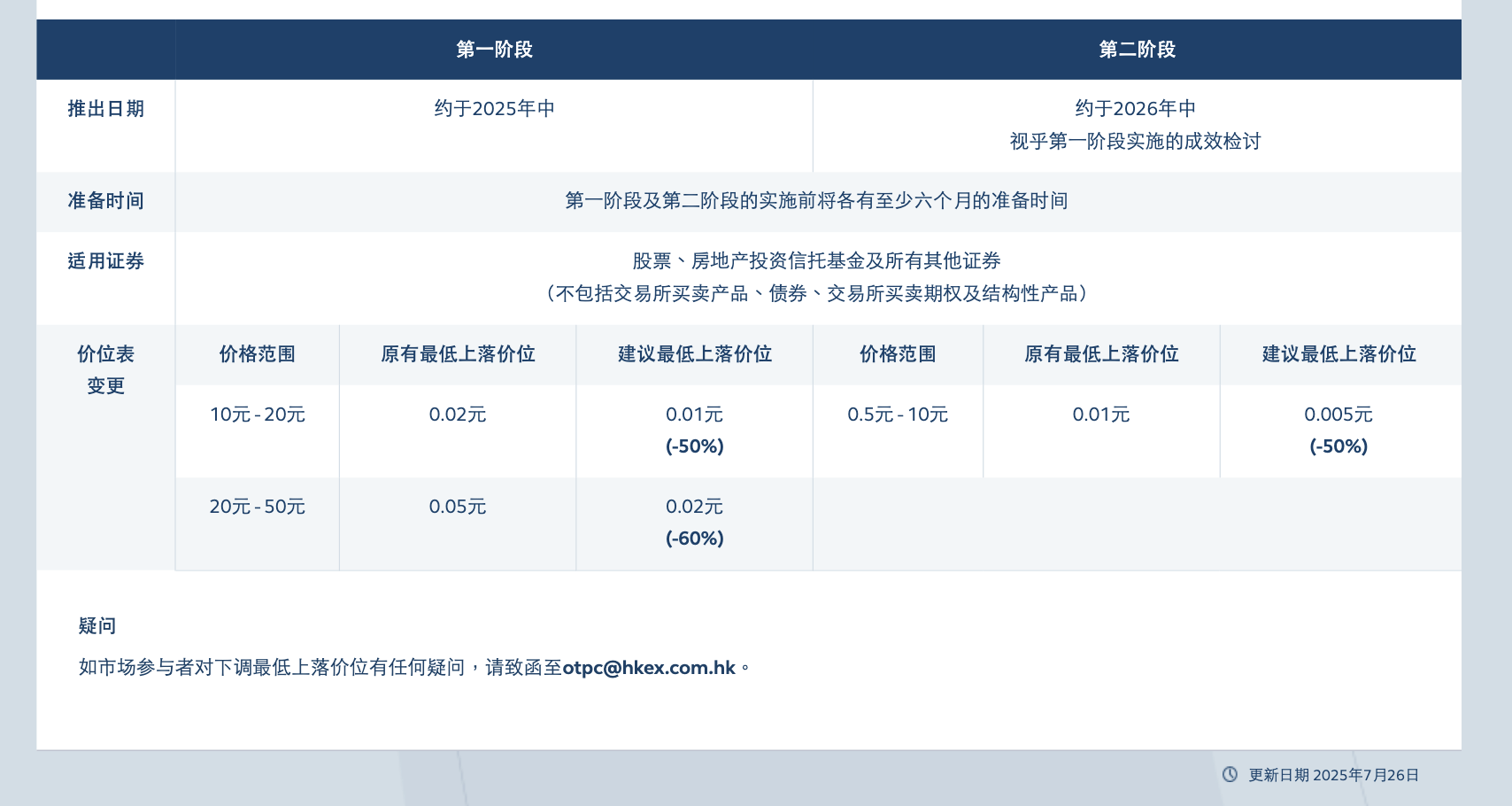 最低上落價(jià)位是每只股票的最小價(jià)格變動(dòng)單位,這項(xiàng)措施將有助于降低市場(chǎng)的交易成本并提升交易效率。以10至20港元區(qū)間標(biāo)的為例,該指標(biāo)將從0.02港元降至0.01港元;20至50港元區(qū)間標(biāo)的則由0.05港元調(diào)至0.02港元。