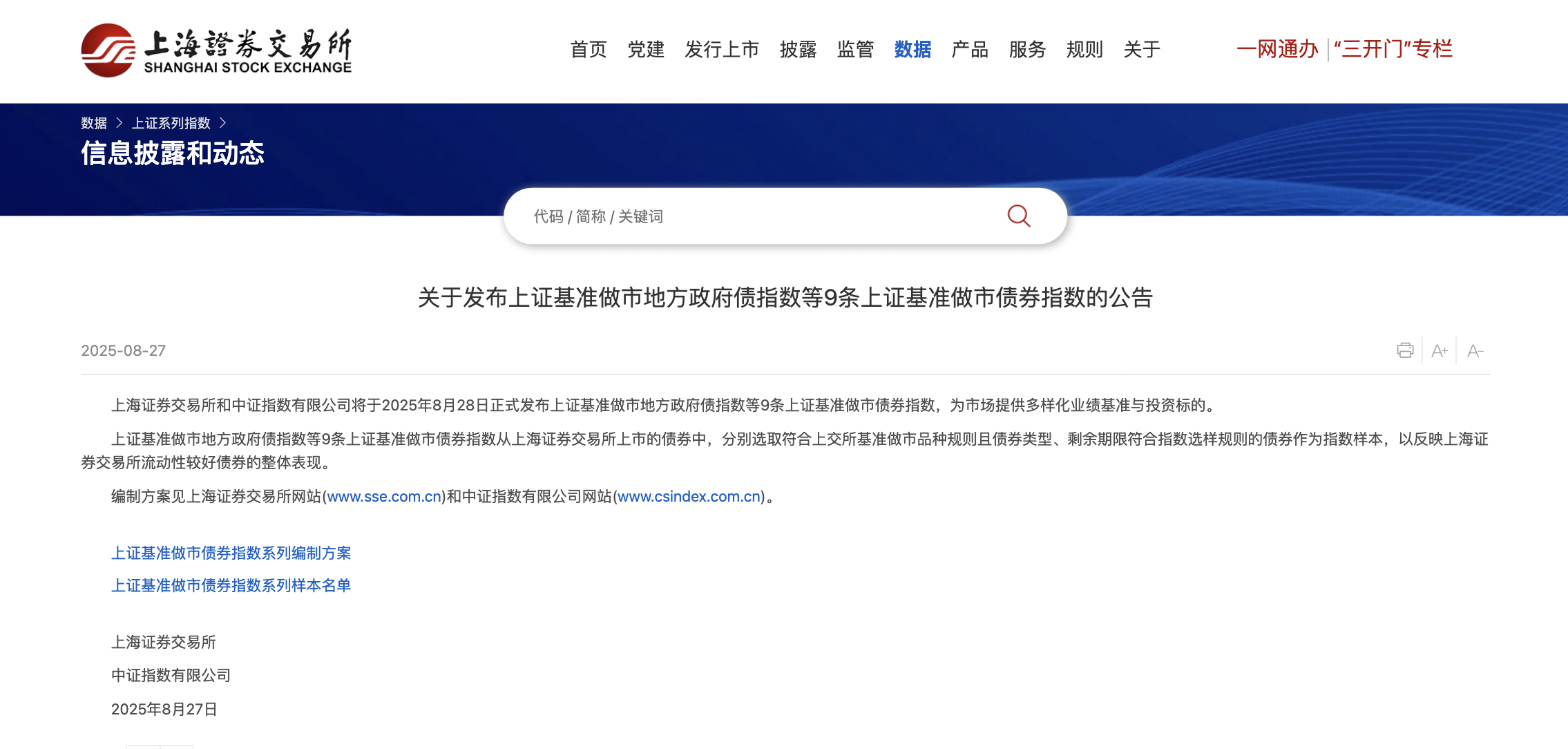 本報訊 (記者毛藝融)8月27日,記者從上海證券交易所獲悉,上海證券交易所和中證指數(shù)有限公司將于2025年8月28日正式發(fā)布上證基準(zhǔn)做市地方政府債指數(shù)等9條上證基準(zhǔn)做市債券指數(shù),為市場提供多樣化業(yè)績基準(zhǔn)與投資標(biāo)的。