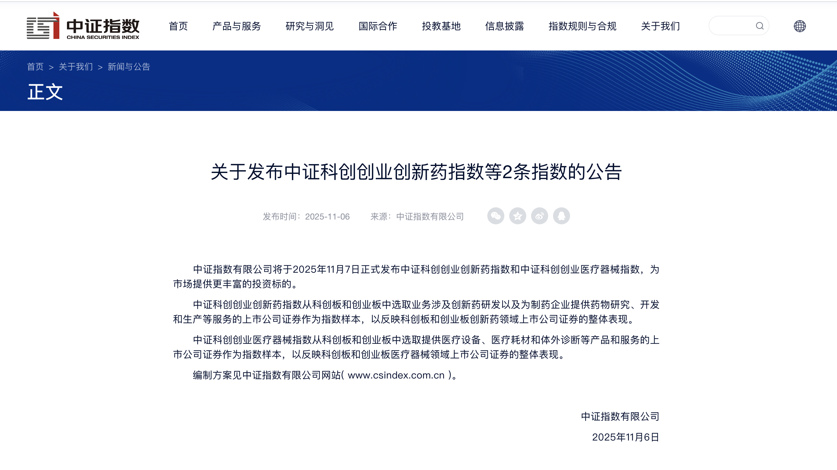 本報(bào)訊 (記者毛藝融)11月6日,中證指數(shù)有限公司公告稱(chēng),將于2025年11月7日正式發(fā)布中證科創(chuàng)創(chuàng)業(yè)創(chuàng)新藥指數(shù)和中證科創(chuàng)創(chuàng)業(yè)醫(yī)療器械指數(shù),為市場(chǎng)提供更豐富的投資標(biāo)的。