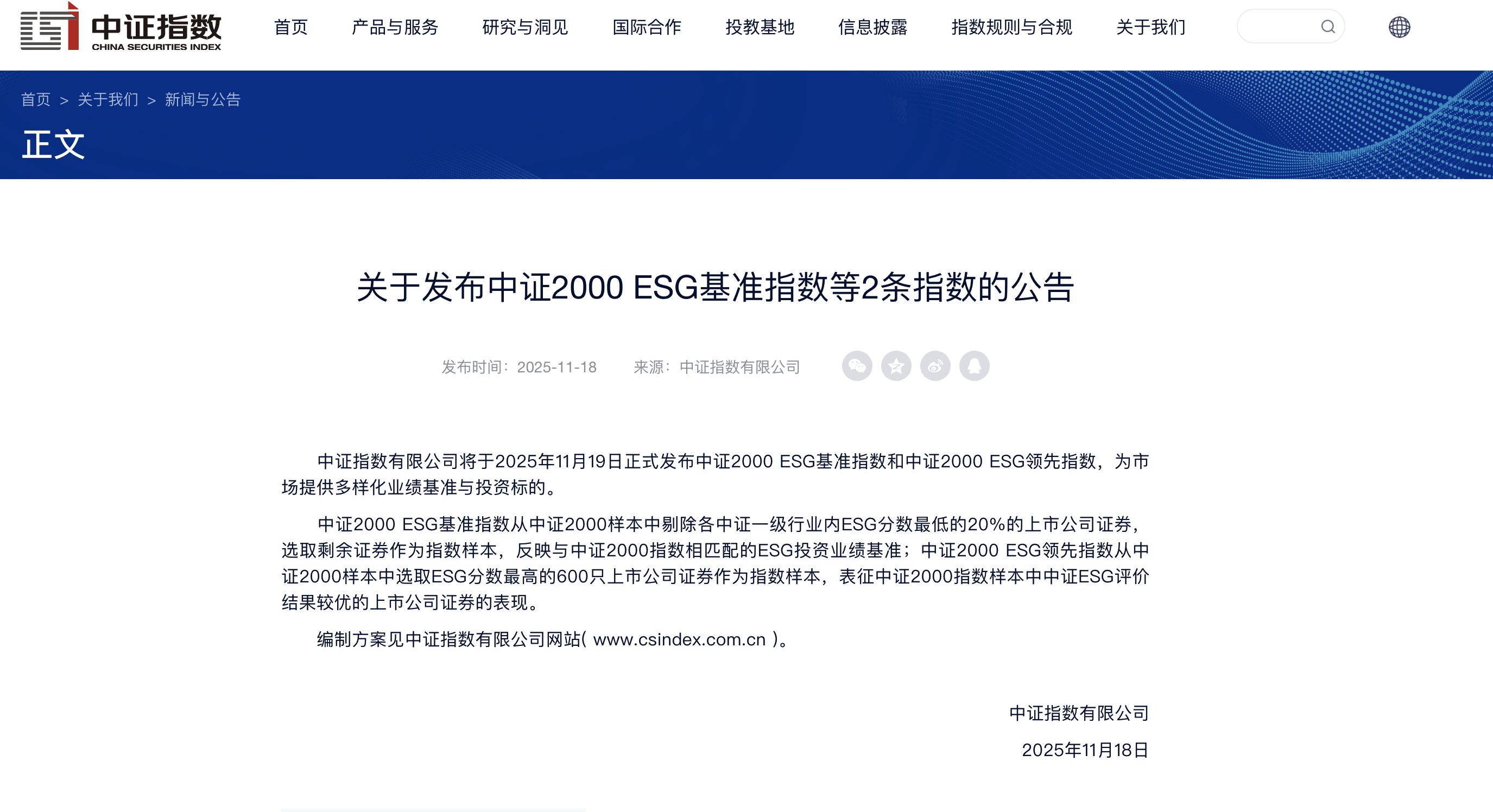 本報訊 (記者毛藝融)11月18日,中證指數(shù)有限公司官網(wǎng)公告稱,將于2025年11月19日正式發(fā)布中證2000ESG基準指數(shù)和中證2000ESG領(lǐng)先指數(shù),為市場提供多樣化業(yè)績基準與投資標的。