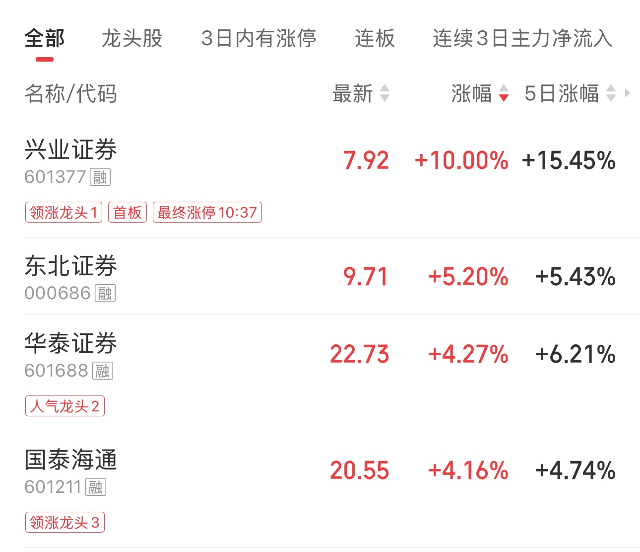 除因并購重組事項停牌的中金公司、信達證券、東興證券外,板塊內(nèi)其余47只個股全線飄紅,興業(yè)證券漲停,半日成交額達47.62億元;東北證券漲超5%,華泰證券、國泰海通均漲超4%;行業(yè)龍頭中信證券半日成交額超65億元。