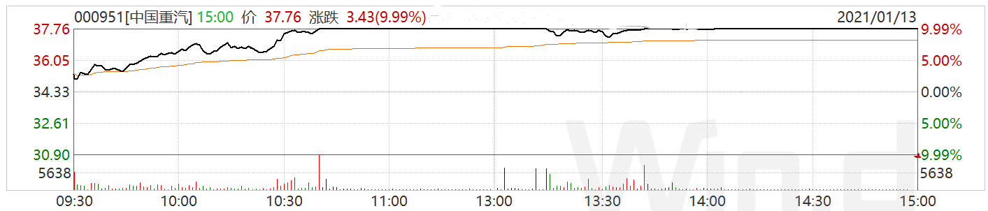 (中國(guó)重汽1月13日A股、紅籌股走勢(shì)圖)