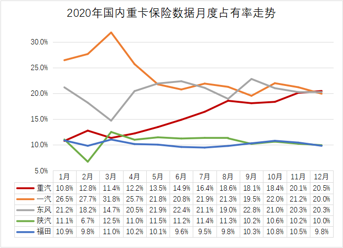 《證券日?qǐng)?bào)》記者獲悉,2020年12月份,中國(guó)重汽重卡保險(xiǎn)數(shù)達(dá)到25848輛,市場(chǎng)占有率達(dá)到20.5%,超過(guò)一汽、東風(fēng)、陜汽及福田等主要商用車(chē)企業(yè),成為國(guó)內(nèi)重卡銷(xiāo)量當(dāng)月最高的企業(yè)??v觀2020年全年,中國(guó)重汽市場(chǎng)占有率大幅提升,特別是3月份以后,隨著產(chǎn)品調(diào)整到位,公司產(chǎn)品市占率平均每月上升1個(gè)百分點(diǎn)。