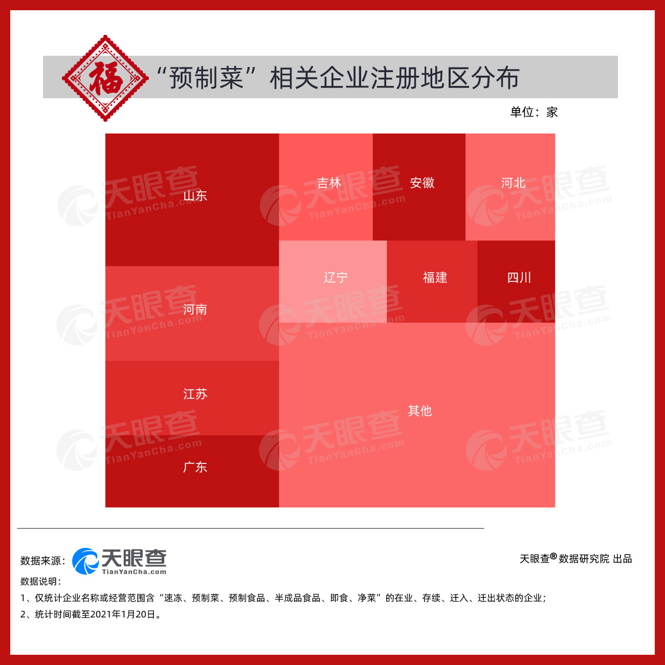 據天眼查大數(shù)據顯示,“預制菜”相關企業(yè)在近兩年快速崛起。通過界定企業(yè)名稱或經營范圍包含“速凍、預制菜、預制食品、半成品食品、即食、凈菜”的企業(yè)發(fā)現(xiàn),截止目前,我國共有超過6.9萬家相關企業(yè)。從地域分布來看,山東省的相關企業(yè)數(shù)量最多,超9400家,占全國的13.71%。河南、江蘇、廣東均擁有超過5000家相關企業(yè),分別位列全國第二、三、四位。