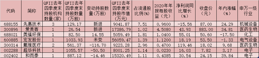 隨著2020年年報(bào)陸續(xù)披露,QFII持倉(cāng)情況也逐漸揭曉。《證券日?qǐng)?bào)》記者根據(jù)同花順數(shù)據(jù)統(tǒng)計(jì)發(fā)現(xiàn),截至3月1日收盤,在已披露2020年年報(bào)的上市公司中,有7家公司的前十大流通股股東中出現(xiàn)了QFII的身影,其合計(jì)持有3776.19萬股,累計(jì)持股市值達(dá)12.01億元。其中,有3家公司股票成為QFII去年四季度新進(jìn)增持品種,合計(jì)增持資金達(dá)2.73億元,投資風(fēng)格偏向業(yè)績(jī)超預(yù)期的績(jī)優(yōu)股品種。