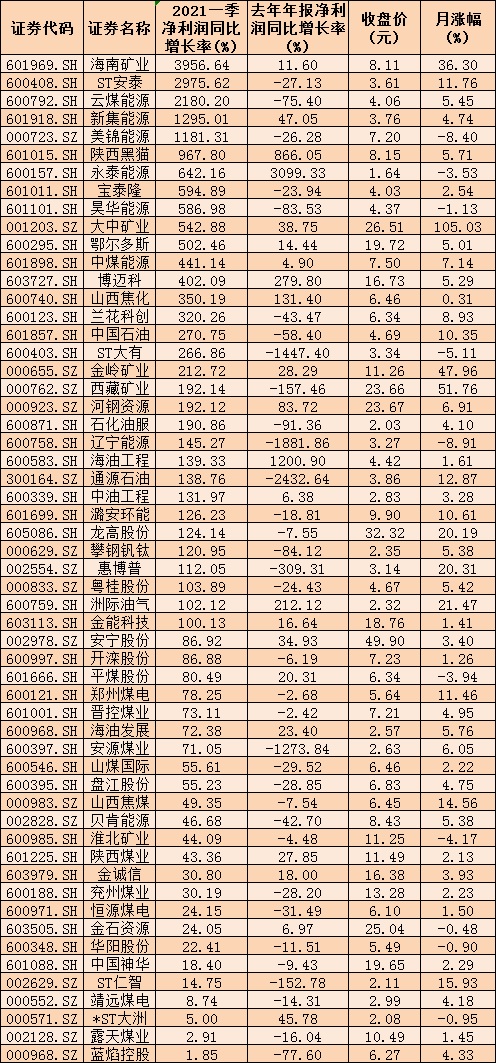 從個(gè)股方面來(lái)看,采掘行業(yè)中,有56家公司一季報(bào)凈利潤(rùn)同比實(shí)現(xiàn)增長(zhǎng),占行業(yè)內(nèi)成份股的83.58%。其中,海南礦業(yè)、ST安泰、云煤能源、新集能源、美錦能源等5只個(gè)股,凈利潤(rùn)同比增幅均超10倍,分別為3956.64%、2975.62%、2180.2%、1295.01%、1181.3%。